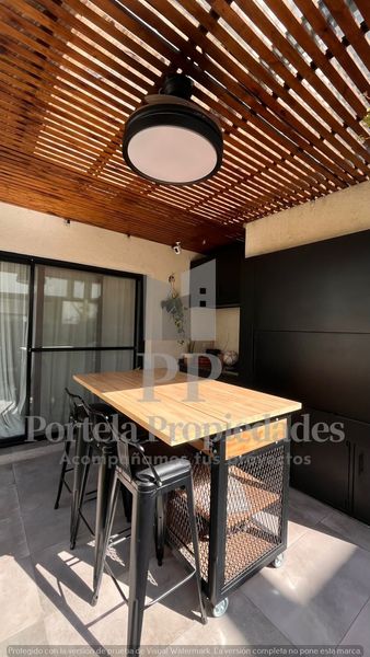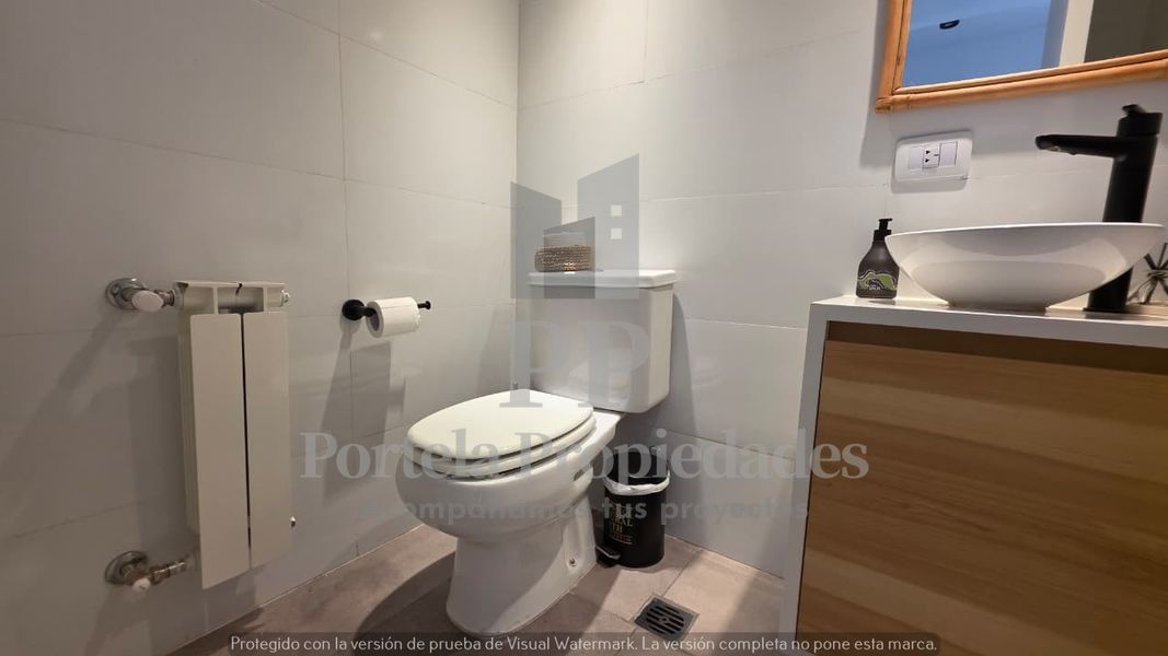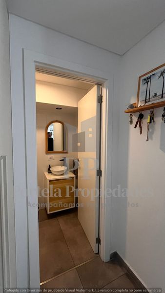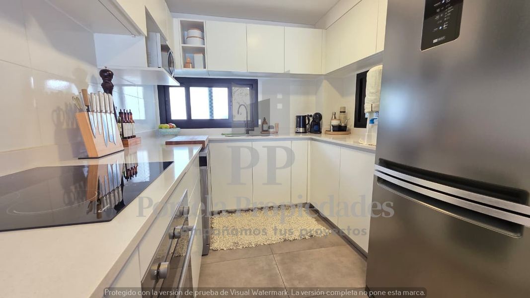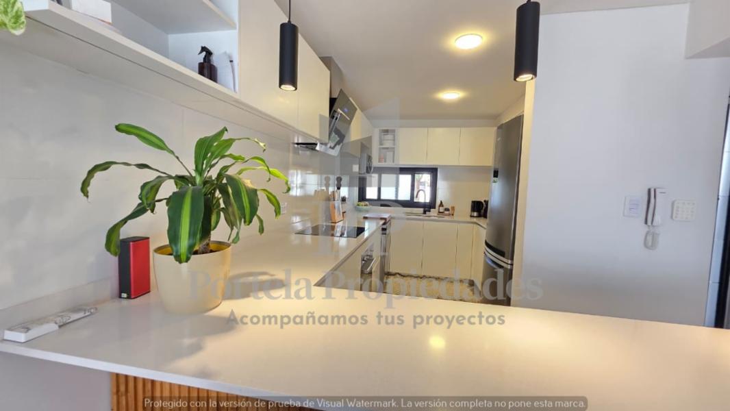 PB: LIVING COMEDOR AMPLIO CON COCINA INTEGRADA, TOTALMENTE EQUIPADA, CON BARRA Y MESADA DE SILESTONE BLANCO, CAMPANA Y ARTEFACTOS A GAS. TOILETTE DE RECEPCIÓN Y LUGAR DE GUARDADO EN UN PLACAR EMPOTRADO.